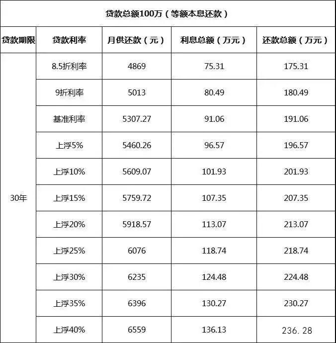 (等額本息還款對(duì)照表,上浮30%利息漲33萬)