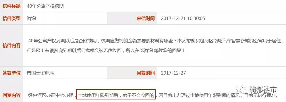 今天,在合肥12345上,合肥市國(guó)土資源局回復(fù)有關(guān)“40年公寓產(chǎn)權(quán)到期”的問題,表示:產(chǎn)權(quán)到期,房子不會(huì)收回。