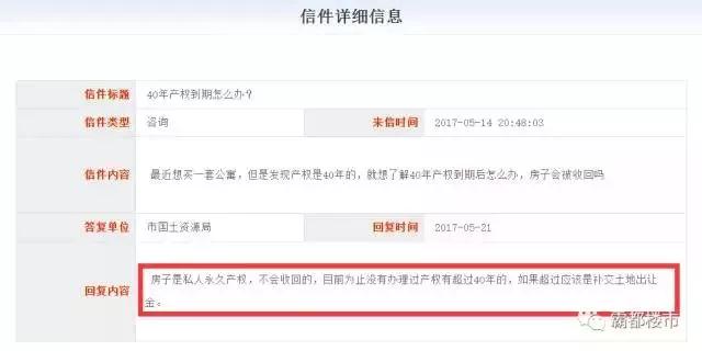 合肥市國(guó)土資源局在今年5月份的時(shí)候,就給出了明確的答復(fù):房子是私人永久產(chǎn)權(quán),不會(huì)收回的,目前為止沒有辦理過產(chǎn)權(quán)有超過40年的,如果超過應(yīng)該是補(bǔ)交土地出讓金。