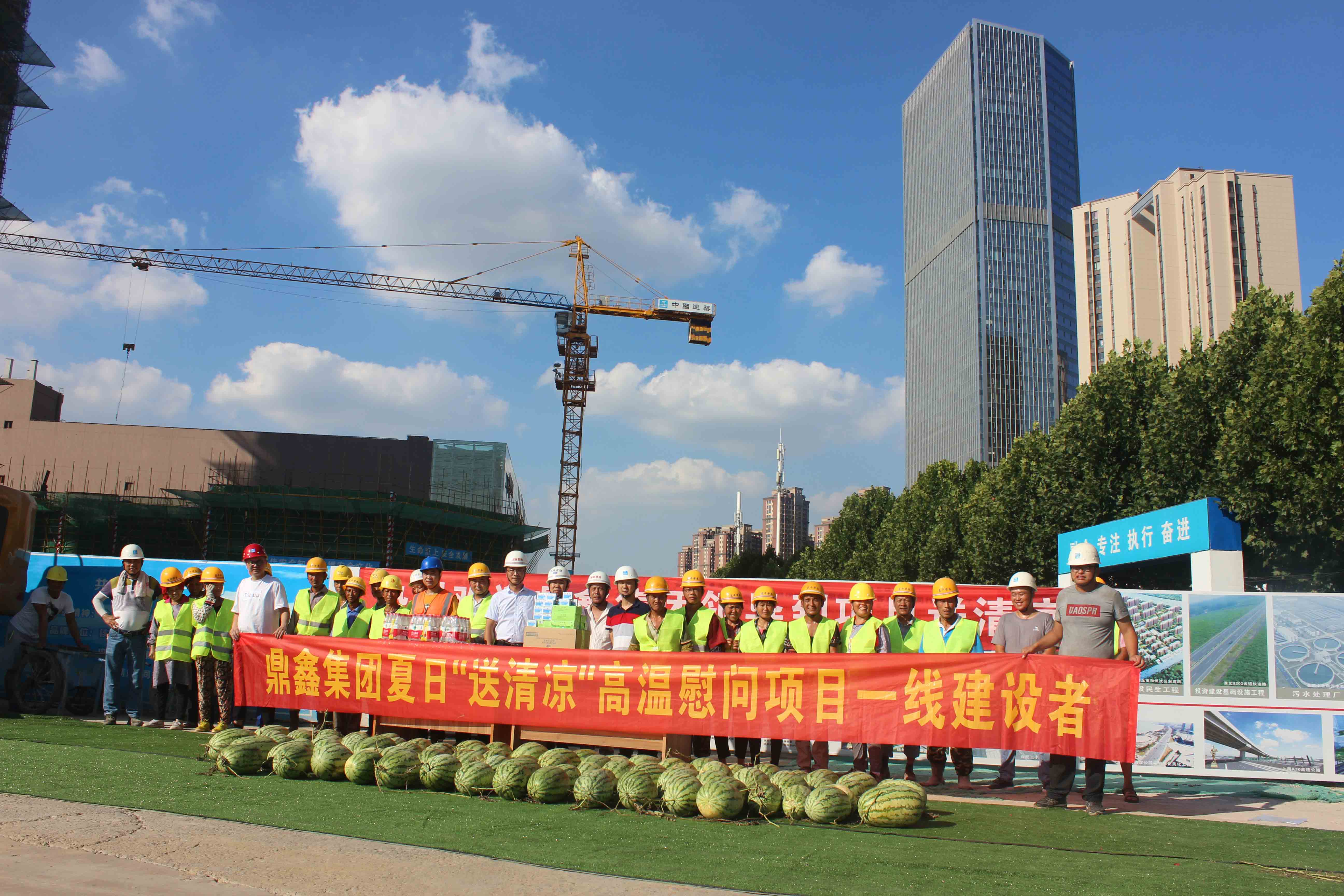2018年7月18日,安徽鼎鑫集團(tuán)總裁張曉東先生、行政部朱雪梅女士、項目部汪承金、谷趁意先生等一行,攜帶西瓜、礦泉水、風(fēng)油精、藿香正氣水等防暑降溫食品、藥物,前往集團(tuán)在建項目【鼎鑫·幸福城】、【鼎鑫·空港企業(yè)園】和【鼎鑫中心】項目,慰問項目工地的全體員工。